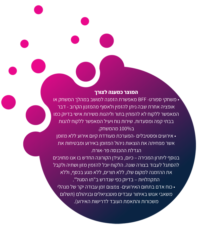 • משחקי ספורט- BFF מאפשרת הזמנה למושב במהלך המשחק או אופציה אחרת שבה ניתן להזמין ולאסוף מהמזנון הקרוב – דבר המאפשר ללקוח לא להמתין בתור וליהנות משירות אישי בדיוק כמו בבתי קפה ומסעדות. שירות נוח ויעיל המאפשר ללקוח להנות ב100% מהמשחק.
